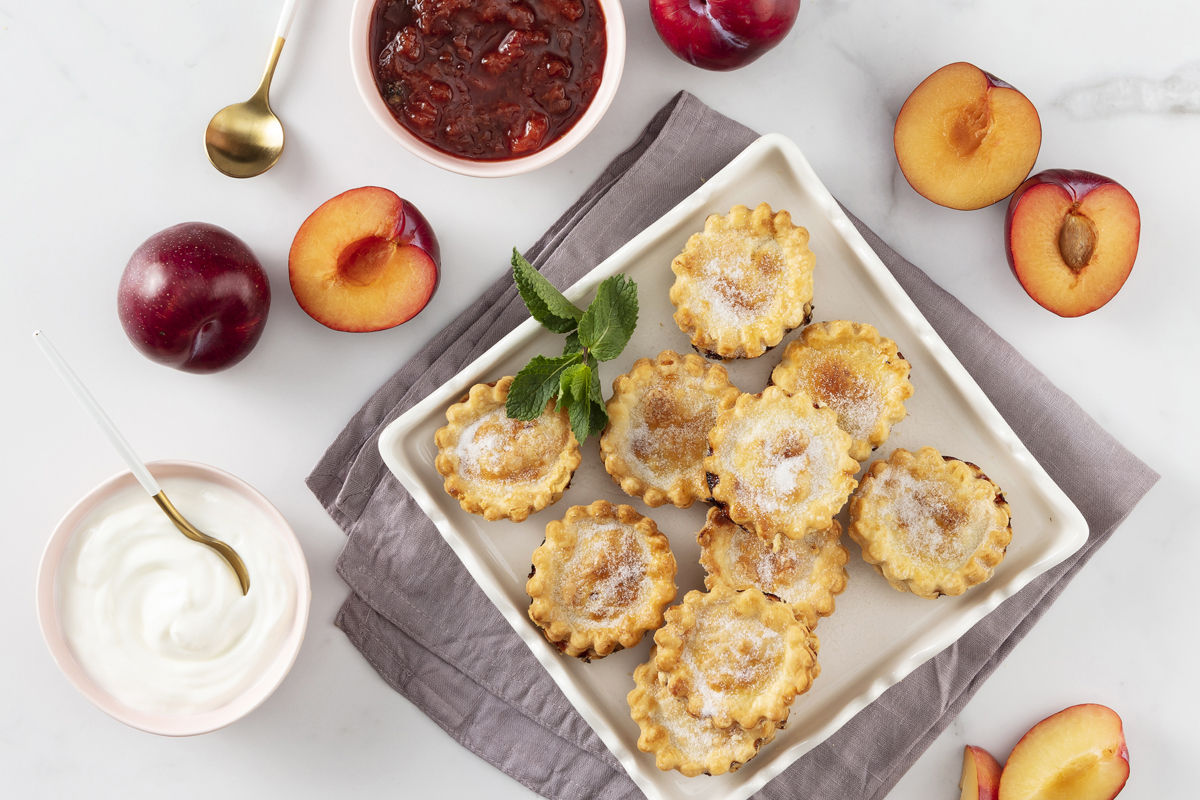 - Spoon some plum filling into each pie crust, filling them about 3/4 full.